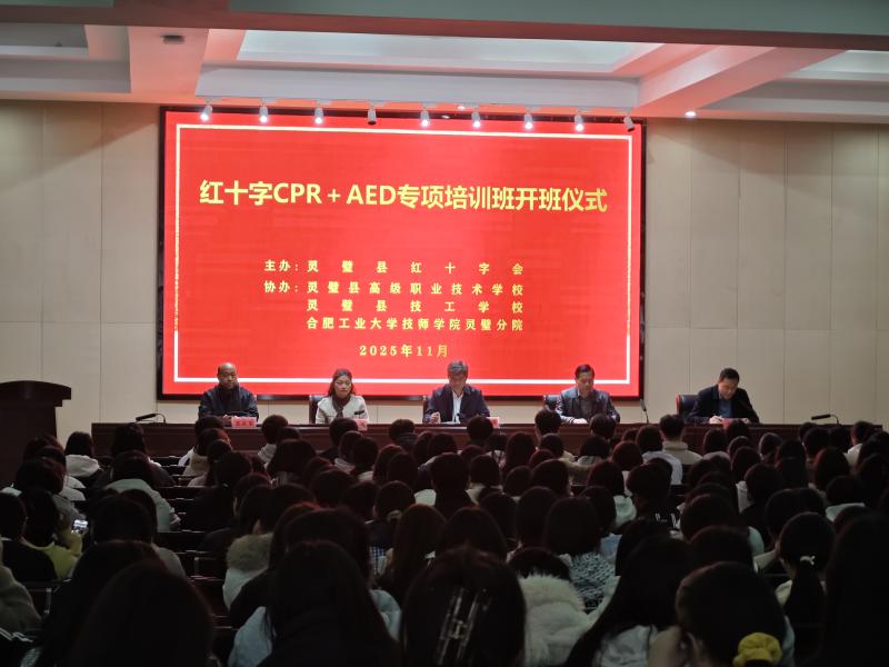 11月4日,由灵璧县红十字会主办,灵璧县高级职业技术学校协办的红十字 CPR+AED 专项培训班在县职高图书楼隆重开班,本次培训班为期 3天,计划培训学生1000余人。县红十字会常务副会长王浩、县高级职业技术学校校长尹成新出席并致辞。
