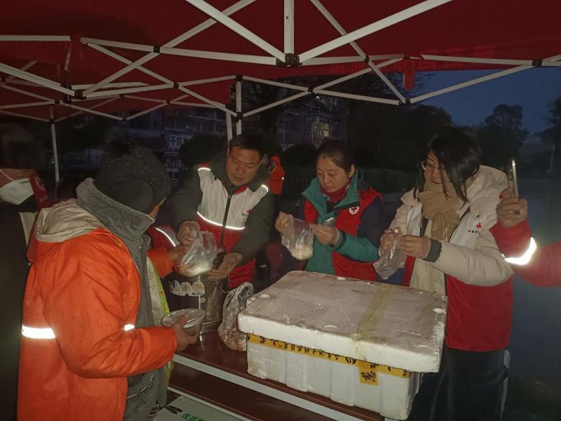 1月26日,腊月初八清晨,寒雨淅沥,灵璧县鹿鸣广场、宏泰广场的帐篷下却涌动着融融暖意,灵璧县红十字会组织县红十字志愿服务队和救援队开展主题为“传承腊八节 浓粥献真情”的志愿服务活动,20余位身着红马甲的红十志愿者冒雨坚守,用1000个热气腾腾的包子,500份香甜八宝粥与500个新鲜鸡蛋,为城区环卫工人、老年人等群体送上节日的关怀。