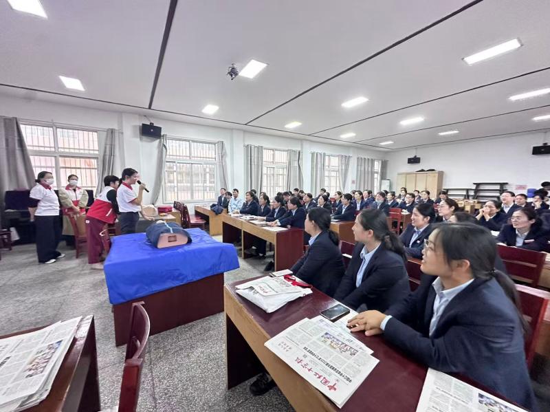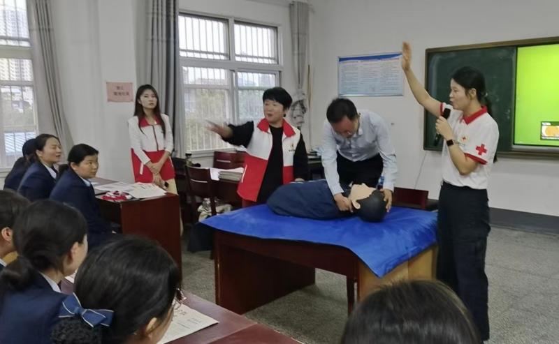 “判断客户是否失去意识,要先轻拍双肩、呼喊姓名,若没有回应,立刻触摸颈动脉,感受是否有搏动——这一步,决定了后续是否需要开展心肺复苏。”培训一开始,红十字志愿服务大队讲师就用农商银行职工熟悉的“客户服务场景”切入,没有晦涩的理论,只有接地气的讲解。从心肺复苏的“黄金4分钟”原理,到胸外按压“深度5-6厘米、频率每分钟100-120次”的标准,再到三角巾包扎时“避开伤口、松紧能伸入一指”的技巧,讲师一边演示,一边拆解关键细节,还时不时提问互动,让课堂氛围既严肃又活跃。